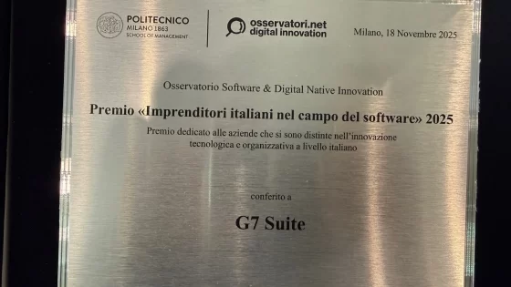 https://www.g7suite.it/wp-content/uploads/2025/11/premio-imprenditori-italiani-nel-campo-del-software-2025-1024x768.webp 1024 768 logika_g7@ logika_g7@ https://secure.gravatar.com/avatar/196d6196f3fdf5b4b5c5a47776f282272b86af727b88b5252d91d25d8ce5449a?s=96&d=mm&r=gSiamo orgogliosi di condividere un importante riconoscimento per G7 Suite Srl. Il 18 novembre 2025, presso il Politecnico di Milano, durante l’evento congiunto organizzato dagli Osservatori Digital Innovation della School of Management del Politecnico di Milano e da Assosoftware, la nostra azienda è stata premiata come terzo classificato a livello nazionale tra le imprese del comparto software.…